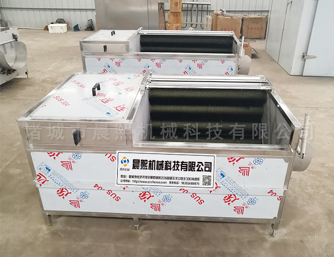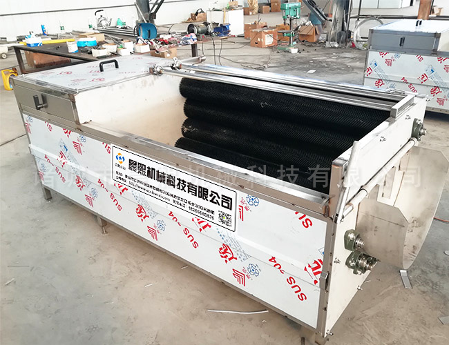 采用刷洗、噴淋技術和毛輥摩擦噴淋,通過毛刷并排往一個方向滾動,使物料滾動到出口的位置,對物料進行清洗,毛刷對物料的褶皺部分進行清洗,清洗效果明顯,是利用水的相互沖擊原理,使物料呈上下左右翻滾狀態,在水的作用下達到去皮的目的,出口處配有噴淋裝置經過二次沖洗,在清洗槽的上方有溢水口,漂浮物可以從溢流槽溢出,下方留有排污口,沉淀物可從排污口排出,達到透徹清洗的目的。分為去皮式的清洗和不去皮清洗的形式。根據實際的需要來選擇清洗的方式。毛刷的軟硬來決定土豆是否去皮。利用毛刷的轉動摩擦清洗土豆,土豆去皮清洗機硬質的毛刷摩擦可以將土豆的皮摩擦去掉,摩擦清洗只是對土豆的表皮摩擦清洗干凈,不會損傷土豆的肉質。設計為正轉和反轉兩種形式,清洗完畢后可以利用毛刷的轉動將土豆旋轉出料