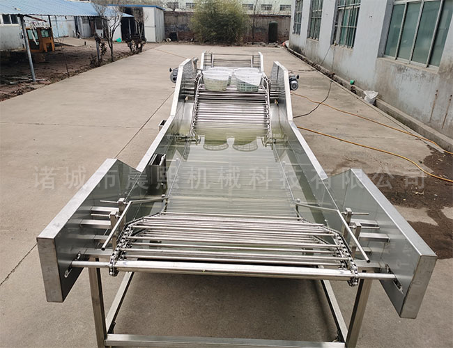 設備除電機、軸承等標準件外均采用不銹鋼材料制作,完全符合出口食品衛生要求。蔬菜清洗設備中設有氣泡發生裝置,使物料呈翻滾狀態,去除產品表面農殘功效,同時可加入適量的藥劑,進行消毒固色,漂浮物可以從溢流槽溢出,沉淀物從口排出,以達到清洗的目的。